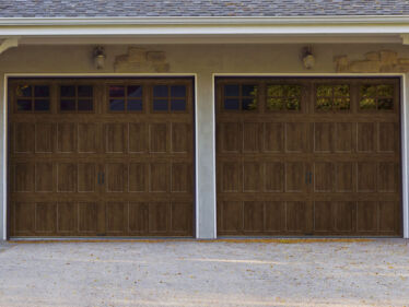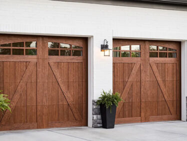 Insulated faux wood garage doors with a classic chevron pattern detail.
